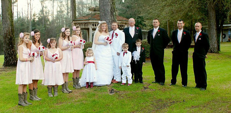 This bride chose the Red, Pink, and Ivory Hand Tie for herself and her entire bridal party. Her silk wedding flowers look amazing in this outdoor environment.