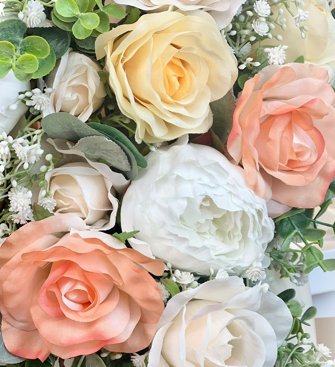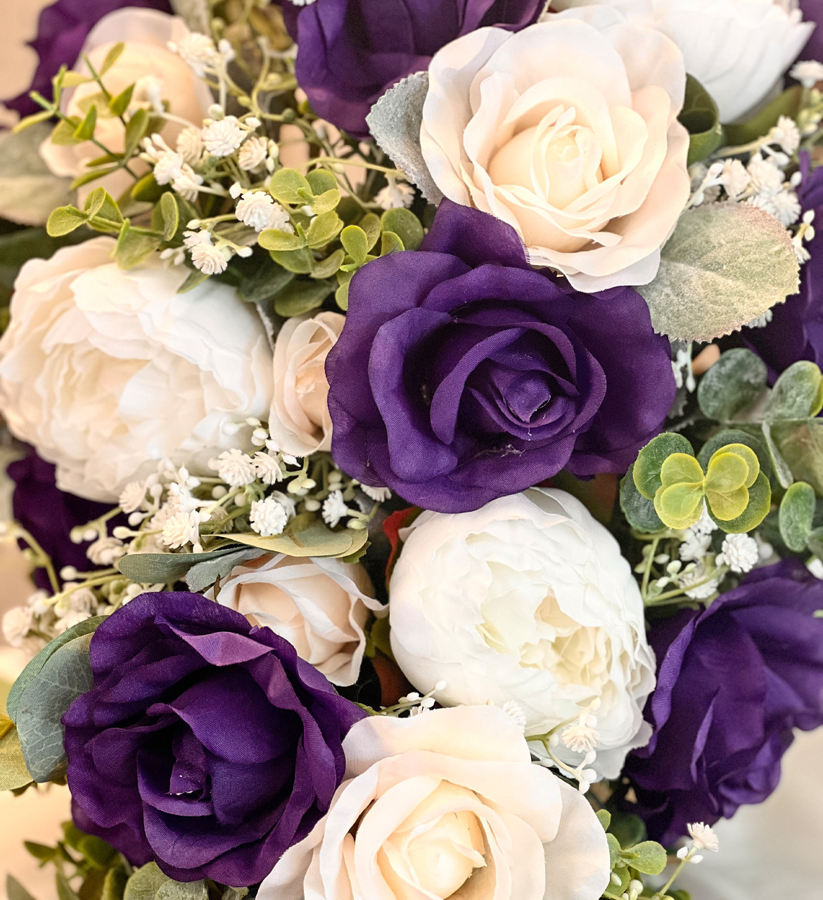 Our selection of artificial wedding bouquets, corsages, boutonnieres, silk wedding flower cascades, and fake flower decorations come in a large variety of colors and styles: from rich purples and navy artificial flowers, to soft coral and dusty blue tones. Search silk wedding bouquets by color and flower type to find the perfect looks for you, and check out our blog or our gallery to see some of our gorgeous designs in action!